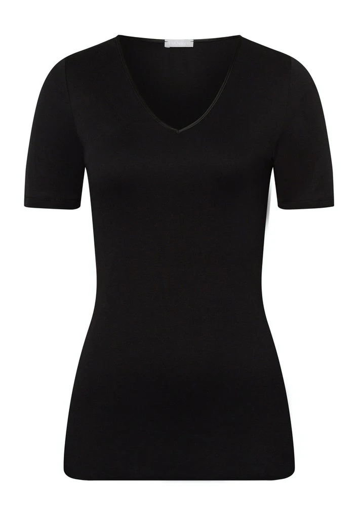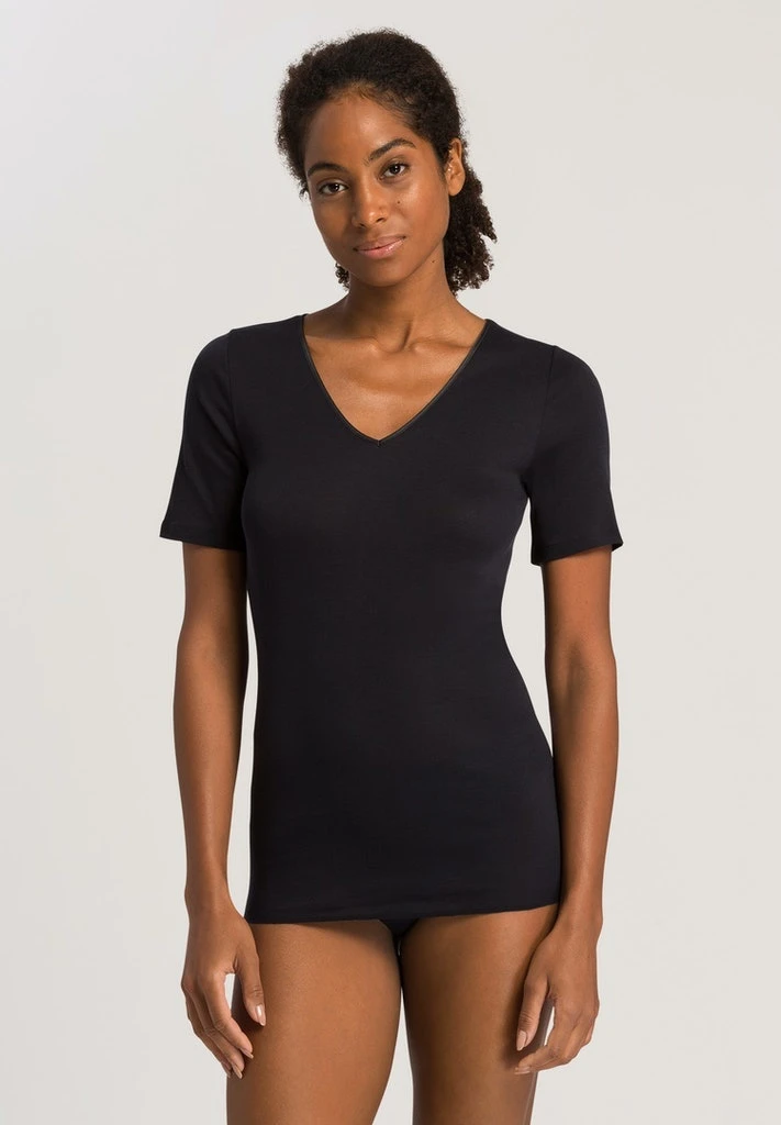 Hanro Cotton Seamless ladies shirt with short sleeves and V-neck. Beautiful waistline and especially soft by mercerised cotton. Flatter elastic satin edging, seamlessly woven and discreet sheen. Elegant, casual or daily under shirt.