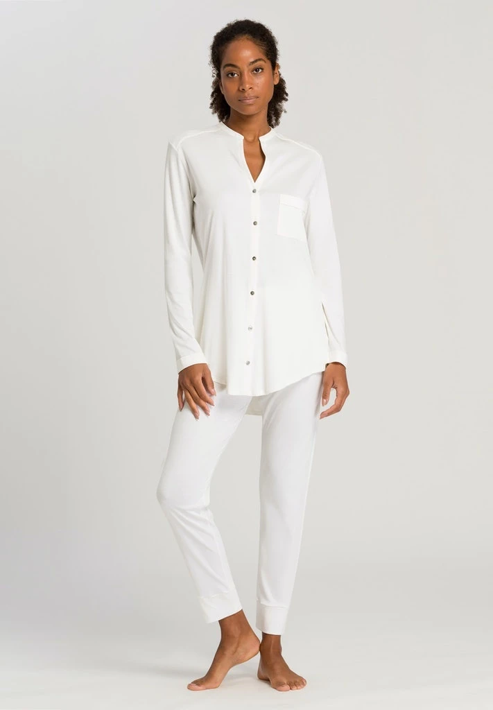 Puristic nightwear made of a particularly soft, opaque, mercerized cotton interlock. Very very feminine pyjama set. Beautiful details as a button down and the pockets and cord.