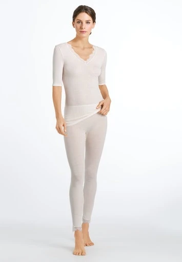 Warm, ribbed material with lace details. Exceptionally lightweight, soft merino wool-silk for a natural temperature regulation. Delicate Jacquardtronic lace.