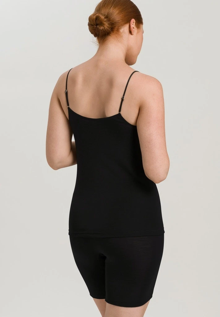 Hanro Woolen Silk ladies Spaghetti Top. Finest merino wool and silk. Seamless and very soft. Temperature and odour regulating. Perfect in winter and summer. Experience luxury and wellness of natural fibers.